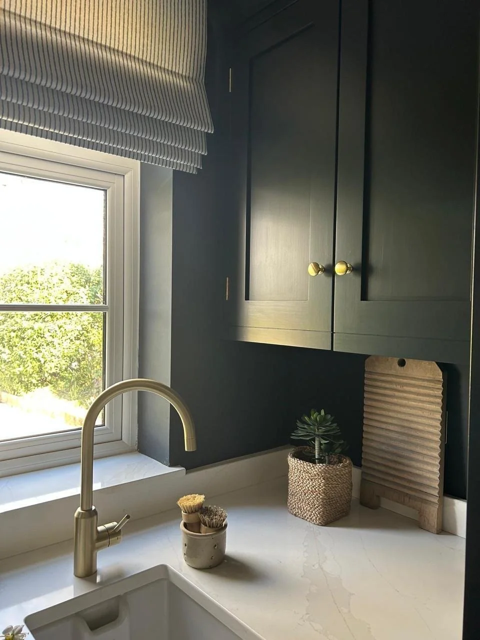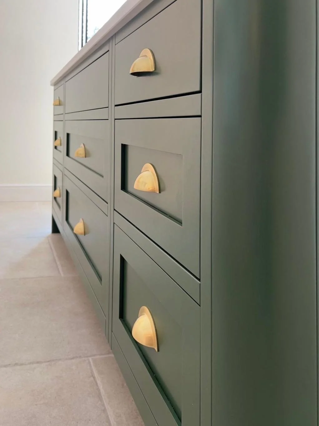 The clients chose a calming colour palette with Farrow & Ball Setting Plaster on the cabinets and Farrow & Ball’s Beverly, a mid forest green for the island, complemented by Crofts & Assinder brushed satin brass handles and Corston wall and pendant lights.